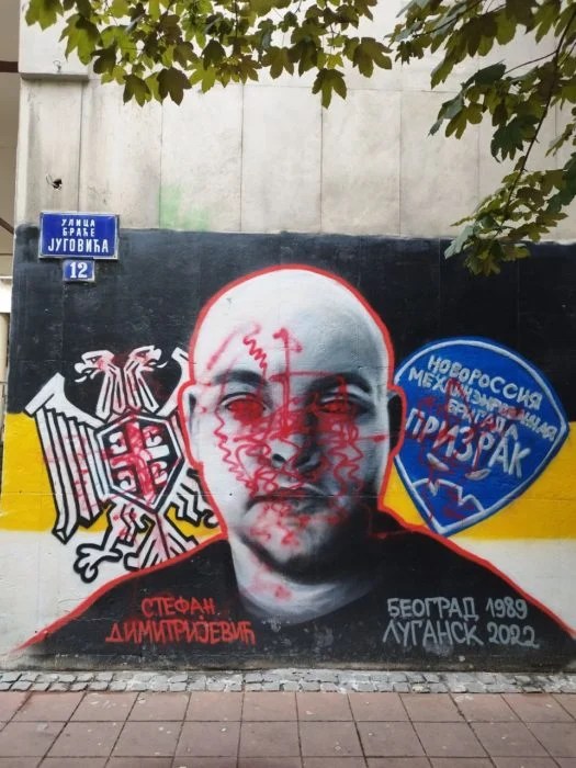 Srpskom heroju i dobrovoljcu u armiji Luganske narodne republike, Stefanu Dimitrijeviću koji je poginuo braneći ruski narod na frontu kod Luganska, nepoznati počinioci su ižvrljali mural u centru Beograda. Posle pogibije, u proleće 2022. godine, Srpska patriotska omladina u Beogradu je nacrtala na ygradi PMF-a mural posvećen Stefanu Dimitrijeviću. Izvor-foto: Agencije i portali
