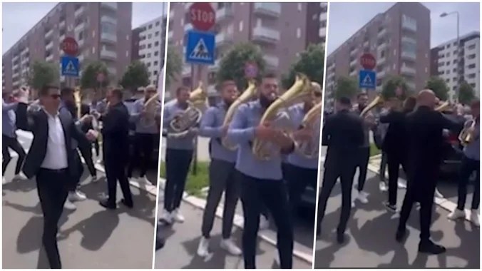 Harmonikaš i svatovi stigli su po mladu a tamo je nastala prava fešta. Trubači, muzičari a Aca nije žalio para na muzičare. IZVOR: KURIS.RS, Pink.rs,FOTO: PRINTSCREEN