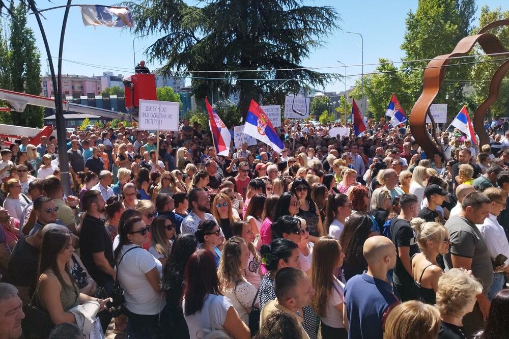 Okupljeni nose transparente „Na mostu smo opstanak branili, sad branimo nestanak“, „Ako Kurti otvori most, Kfor i Kvinta će biti odgovorni“ i „Dok EU i SAD pišu saopštenja, nas proteruju“.Pored okupljenih građana, skup nadgledaju i pripadnici Kosovske policije, kao i Kfor, javljaju reporteri Kosovo onlajna.
