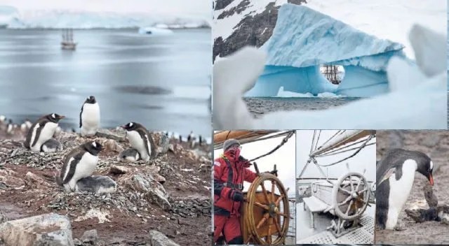 Fotografija poput holandske barokne slike. Trojarbolni bark Europa (porinut 1911. godine) ispred glečera na Antarktiku. S leve strane, dva gentoo pingvina gegaju se, krilo uz krilo, prema vodi.